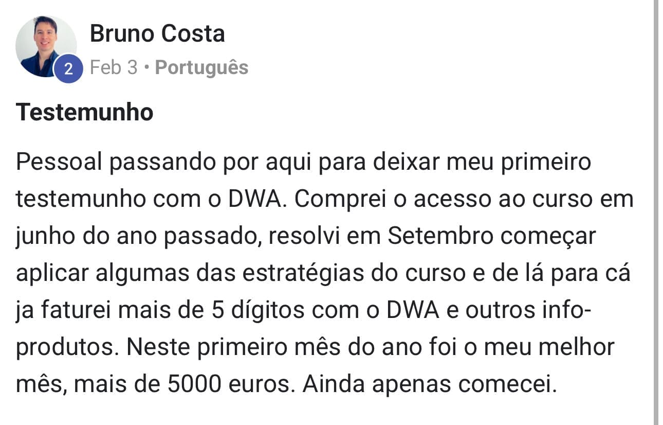 Não se preocupe, muitos de nossos alunos mais bem-sucedidos começaram sua jornada com o Digital Wealth Academy como total iniciantes , possuindo pouco ou nenhum conhecimento ou experiência anterior em marketing digital . O DWA foi meticulosamente projetado para fornecer a você todas as informações e habilidades necessárias para ter sucesso online. Quer você esteja apenas começando hoje ou já tenha algum conhecimento do cenário. digital, nosso programa está estruturado para elevar seus conhecimentos e orientá-lo em cada etapa do caminho rumo ao sucesso.